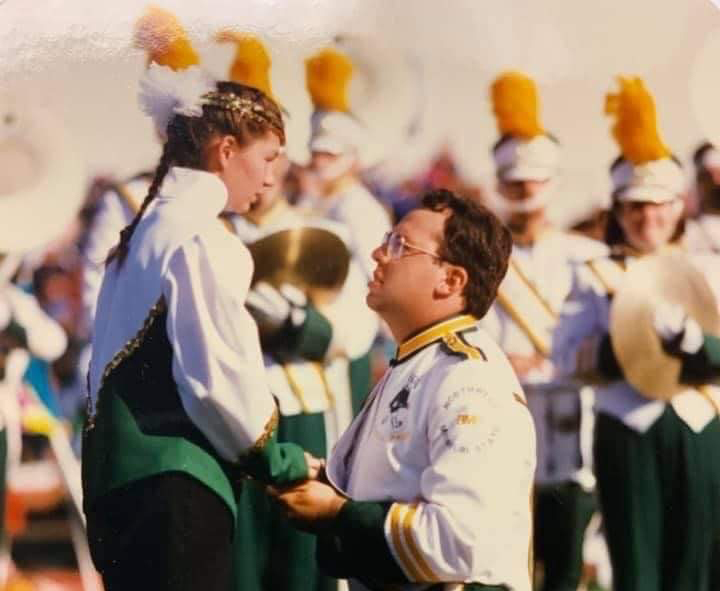 My husband and I met and started dating in college at homecoming – he was in the drumline and I was in the flag corps. He proposed to me my second year at homecoming, on the 50 yard line right after they announced the king and queen. We have a daughter, who loves to dance, sing, perform, and play percussion.